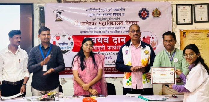 येथील श्री ज्ञानेश्वर महाविद्यालयात राष्ट्रीय सेवा योजना विभागामार्फत एकदिवसीय जिल्हास्तरीय मूल्यशिक्षणांतर्गत अवयवदान जनजागृती कार्यशाळा आयोजित करण्यात आली. या कार्यशाळेसाठी विविध तालुक्यांतील एन.एस.एस. स्वयंसेवक, प्राध्यापक तसेच नर्सिंग महाविद्यालयाचे विद्यार्थी मोठ्या संख्येने उपस्थित होते.